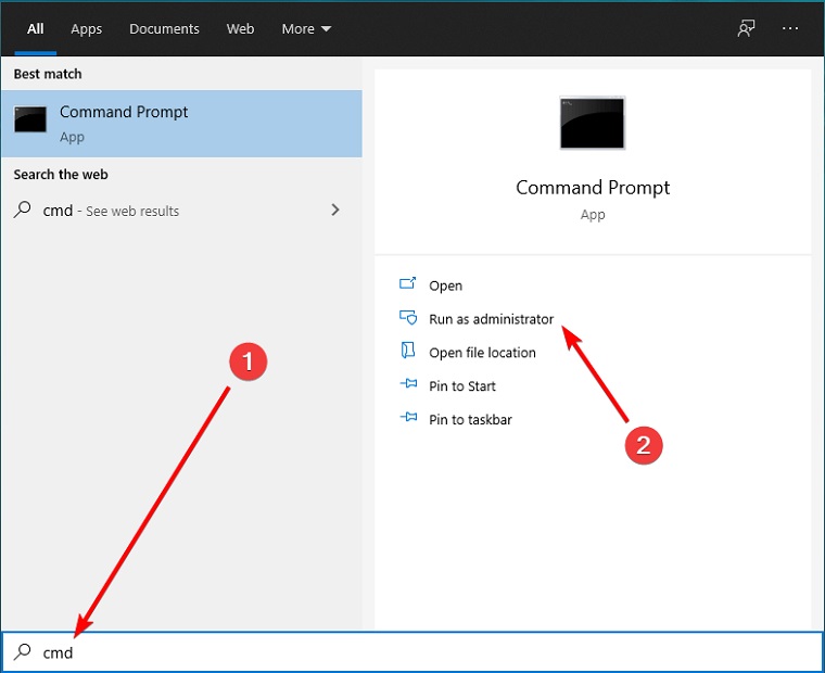 1) Click the Windows start menu and type cmd, then click Run as administrator.